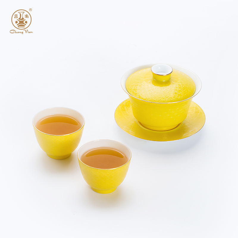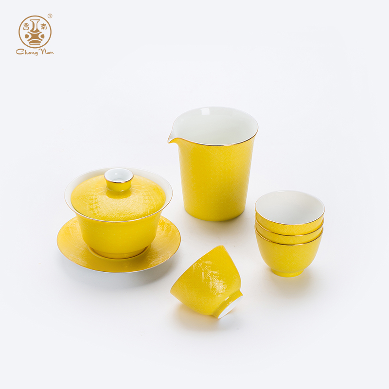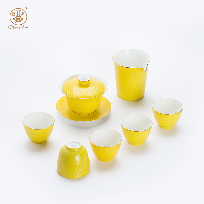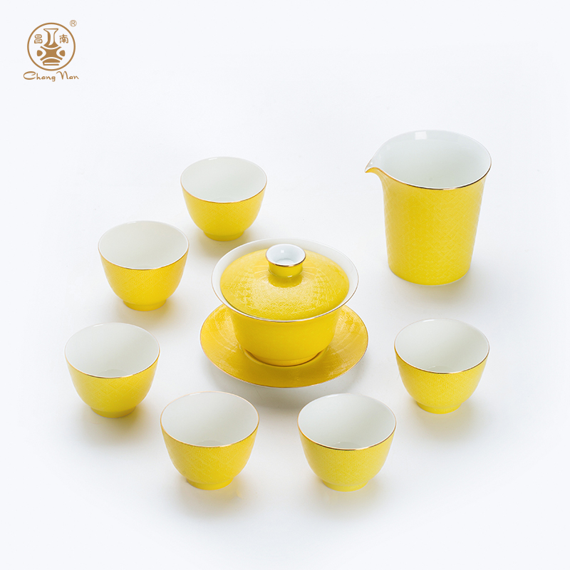 粉彩扒花格桑花系列帝王黃8頭蓋碗套裝